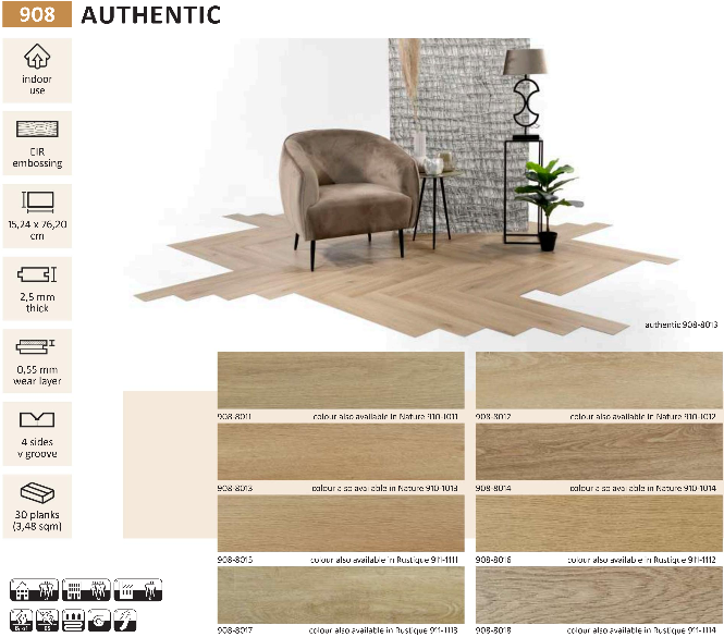 De Identity LVT (PVC) voerbedekking collectie bevat zowel planken als tegels in allerlei kleuren en maten. Met zijn embossed structuur met groeven en noesten die voelbaar zijn aangebracht in de bovenstructuur van het materiaal, zodat het voelt als echt hout of steen. LVT is onderhouds vriendelijk en is bestand tegen water en geschikt voor vloer verwarming. HQ Identity Authentic Visgraat-8015 ook verkrijgbaar in Plank 121.92 cm x 22.86 cm (Rustique 1111)
