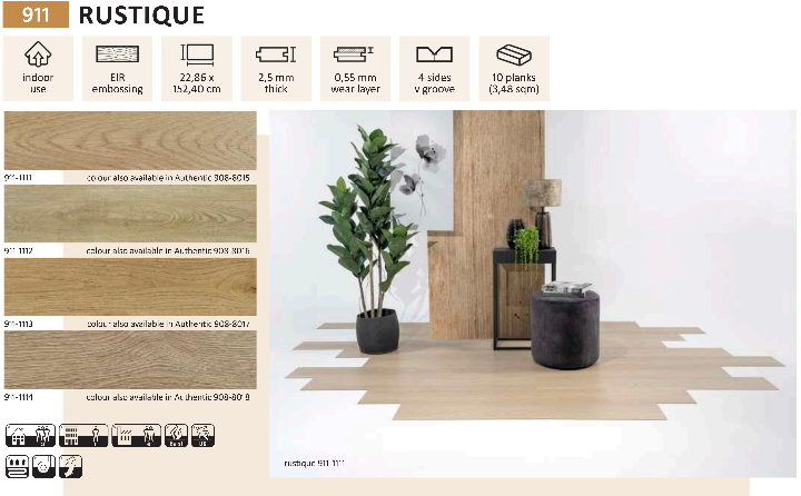 HQ Identity Rustique Plank, 1113, Pak á 3,48 m2; Afmetingen 152,4 cm x 22,86 cm x 2,5 mm HQ Identity Rustique Plank, 1113 dryback is een mooi gevarieerde pvc met met 4 verschillende eiken kleur variaties van licht tot donker vloer is geschikt voor vloerverwarming tot max 27°C. Alle planken hebben aan 4 zijden een microvelling. Note : We raden u aan om op deze vloer zachte wieltjes (type-W) te gebruiken.