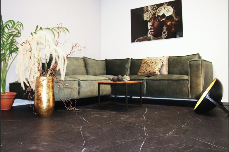 Deze vloer nodigt uit om te variëren met licht en kleur. De Marble Nero geeft karakter en sfeer aan jouw interieur. Met het zonlicht schijnend door het raam en warme kleuren in de kamer geeft deze vloer een warm en sfeervol thuisgevoel.